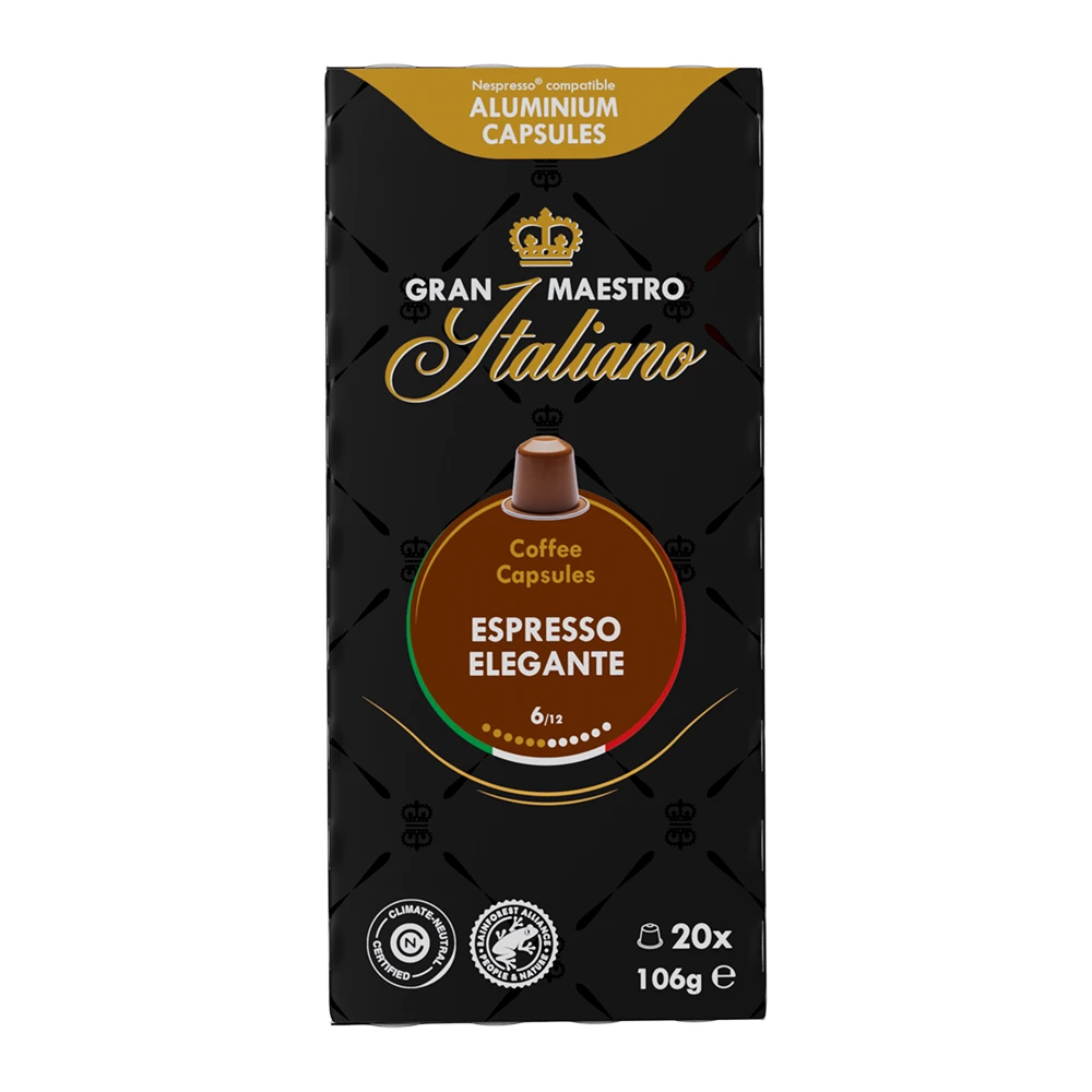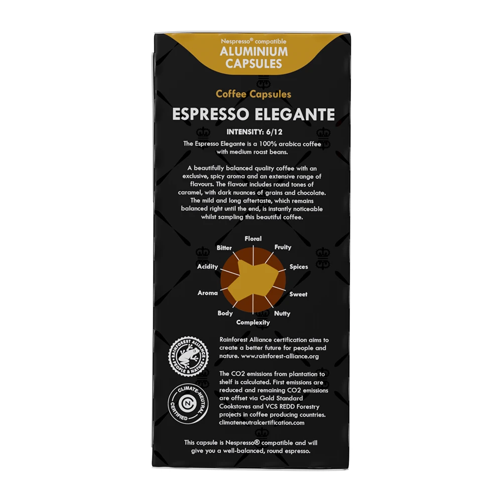 De Espresso Elegante is een 100% arabica blend van medium roast bonen en is afkomstig uit de beste koffiegebieden van Brazilië en Colombia.