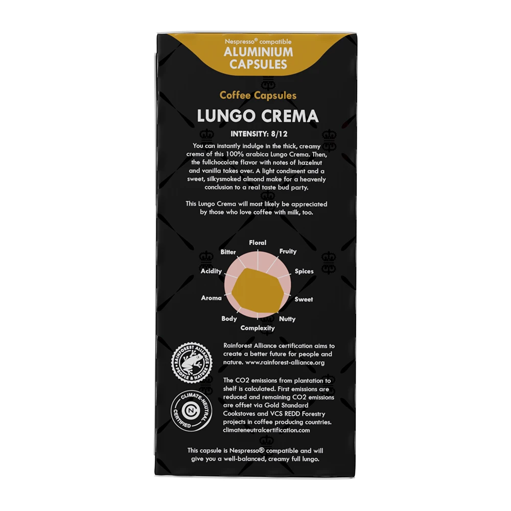 De Lungo Crema is een 100% arabica die je direct verwent met een dikke, romige crema. Hierna krijgen de volle smaak van chocolade met nuances van hazelnoot en vanille de overhand. Vervolgens wordt het feest hemels afgerond met een lichte kruiderij en een zoetig, zijdezacht gerookt amandeltje.