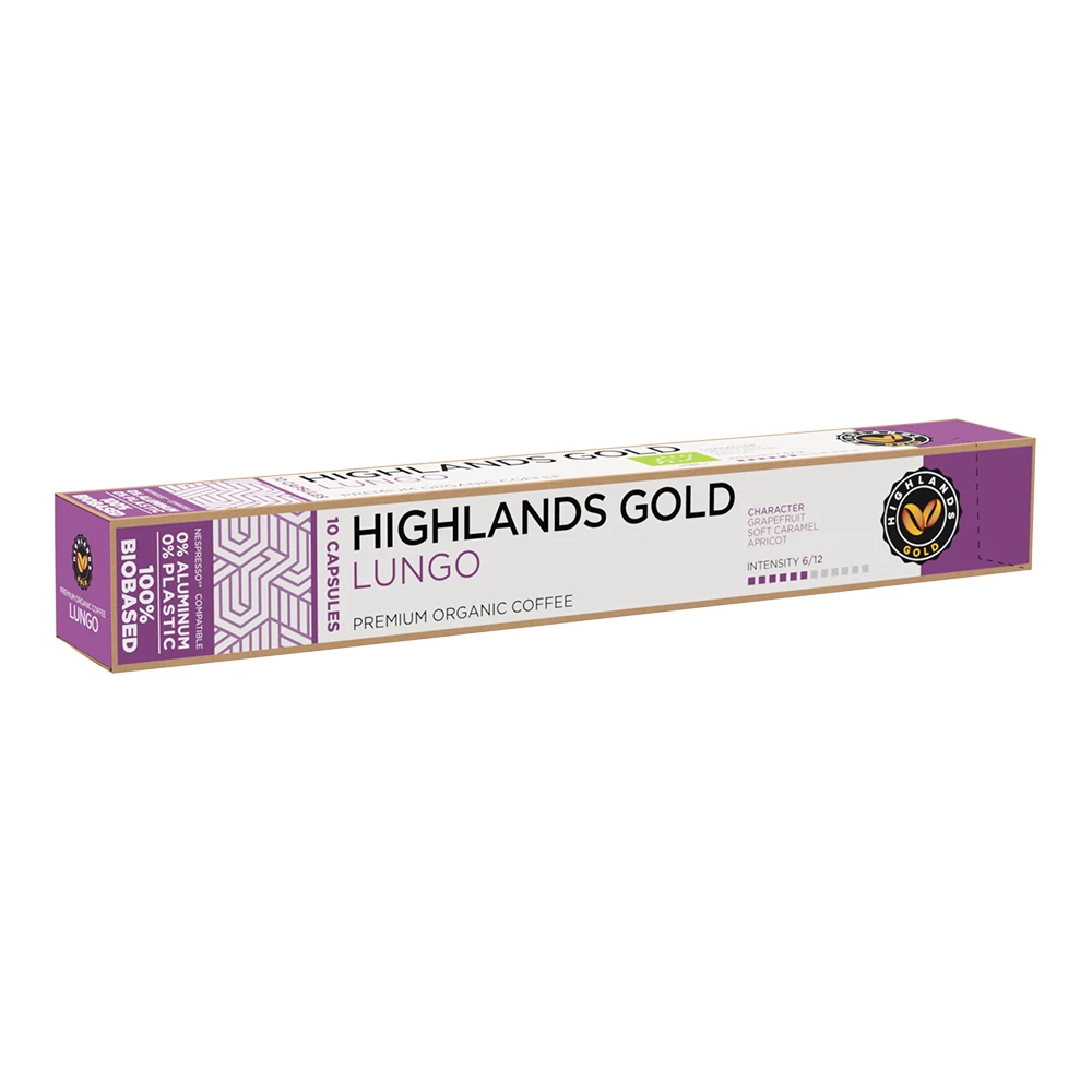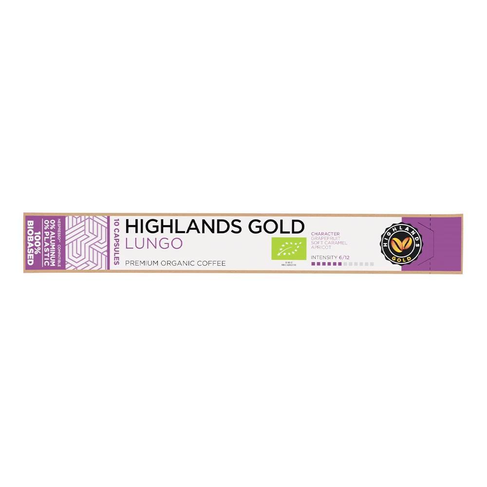 De ‘Lungo’ van Highlands Gold is een 100% biologische koffieblend, die je verrast met fijne aroma’s van grapefruit, abrikoos en zachte karamel en een aangename frisse afdronk. Het is een perfect gebalanceerde, frisse lungo die je de hele dag door kunt drinken. De zachte blend is een samenstelling van de beste bonen uit gecertificeerde koffieplantages in Peru, Guatemala, Colombia en Honduras. De capsules zijn 100% afbreekbaar. Perfect voor de milieubewuste levensgenieter.