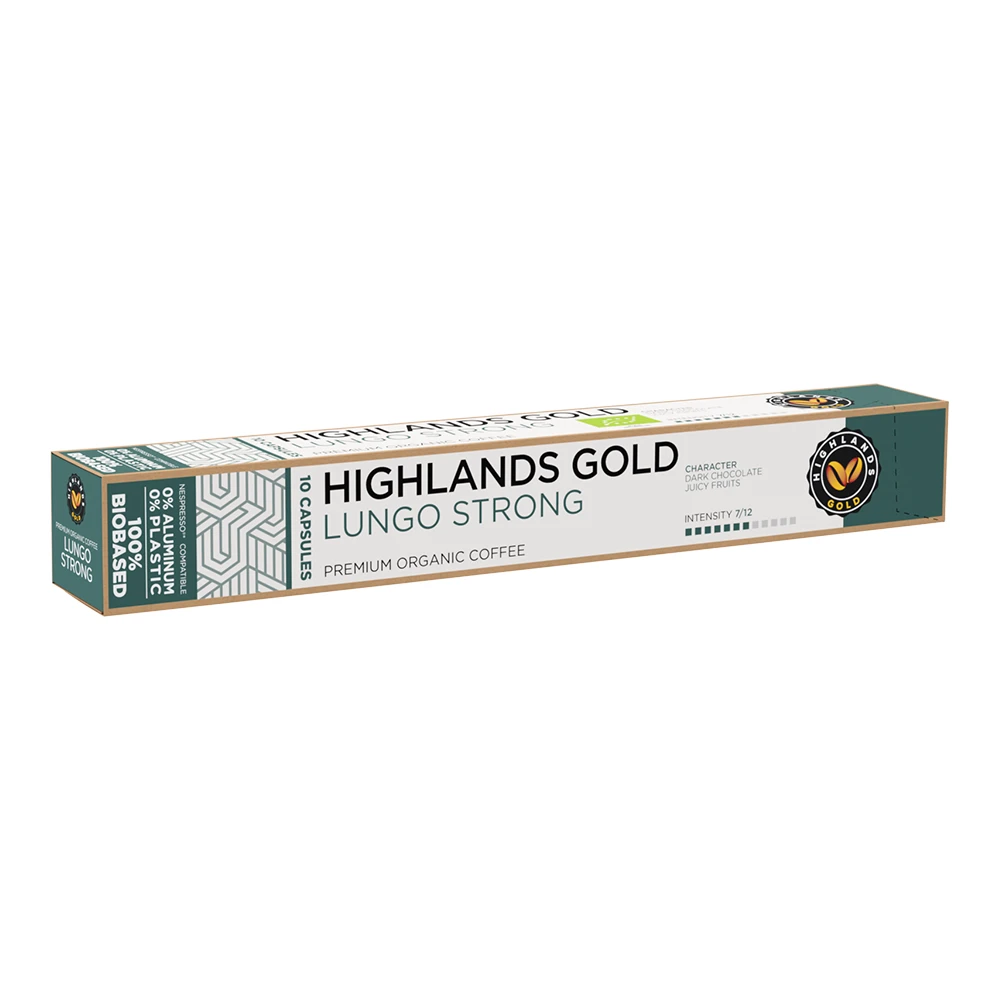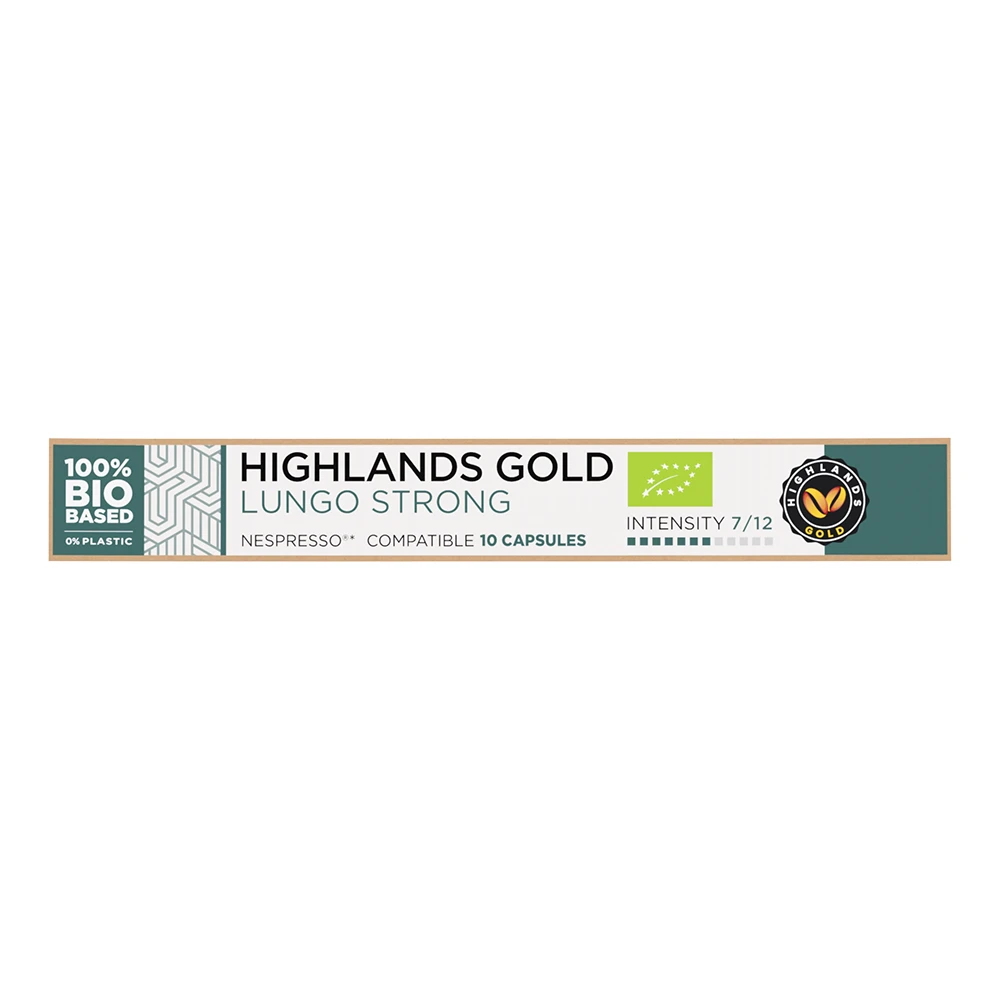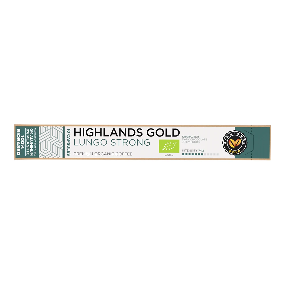 Met de Lungo Strong nespresso compatibele capsules van Highlands Gold zet je een 100% biologische sterke lungo met hinten van donkere chocolade en sappig rijp steenfruit met een aangename lange afdronk. De blend is een samenstelling van de beste biologische koffie uit gecertificeerde plantages in Colombia, Peru, Indonesië en India. De koffie is lekker om de hele dag door te drinken. Om een optimaal resultaat te bekomen worden de bonen licht gebrand. Dit gebeurt volledig C02-neutraal. De Highlands Gold cups voor Nespresso® zijn 100 procent afbreekbaar. Kortom, met deze capsules zet je heerlijke lungo’s om zorgeloos en guilt-free van te genieten.