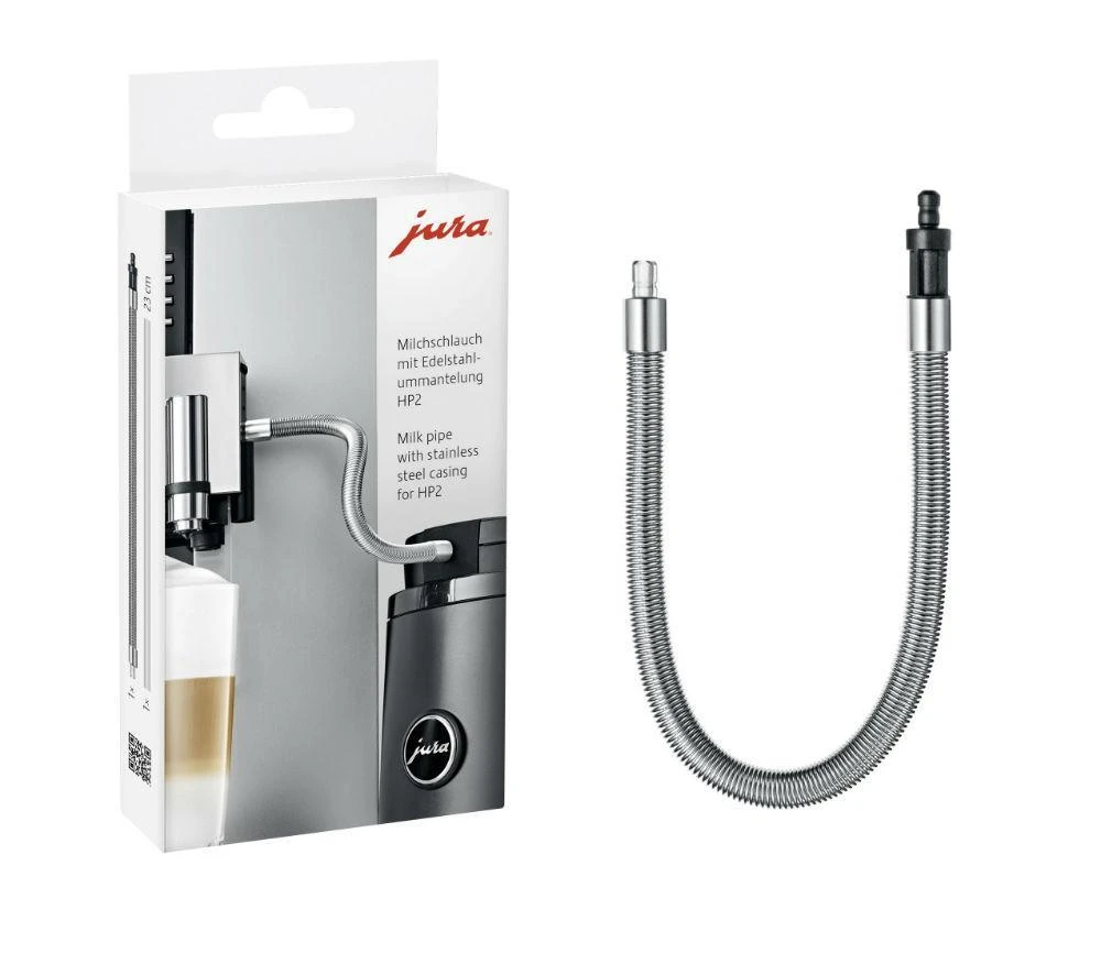 De met roestvrij staal ommantelde melkslang van het type HP2 (GIGA) verbindt de melkhouder met de melkuitloop, en rondt het elegante design van iedere volautomatische koffiemachine op mooie wijze af. De kijkdichte ommanteling is gemaakt van hoogwaardige materialen en garandeert een uitstekende bescherming tegen UV-stralen en lichtinvloeden. De exact passende verbindingen zorgen voor luchtdichte overgangen. Deze melkslang is meteen gebruiksklaar. Het is de perfecte oplossing voor een gelijkblijvende en optimale melkhygiëne.