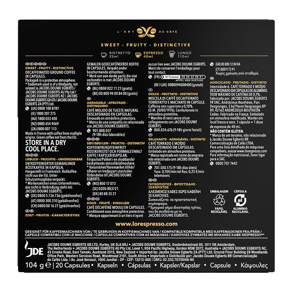 Het rijke, zoete aroma van DECAFFEINATO is de ouverture van deze elegante espresso, gekenmerkt door noten van cacao en een hint van wilde bessen, voor een buitengewone cafeïnevrije espresso ervaring.