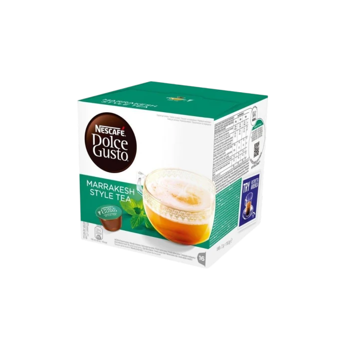 Marrakesh thee is de intens muntige en heerlijke frisse smaak van Marokko. Deze thee heeft de smaak van groene thee en munt met een schuimlaag. De Dolce Gusto Marrakesh Style Tea bevat 16 consumpties per verpakking.