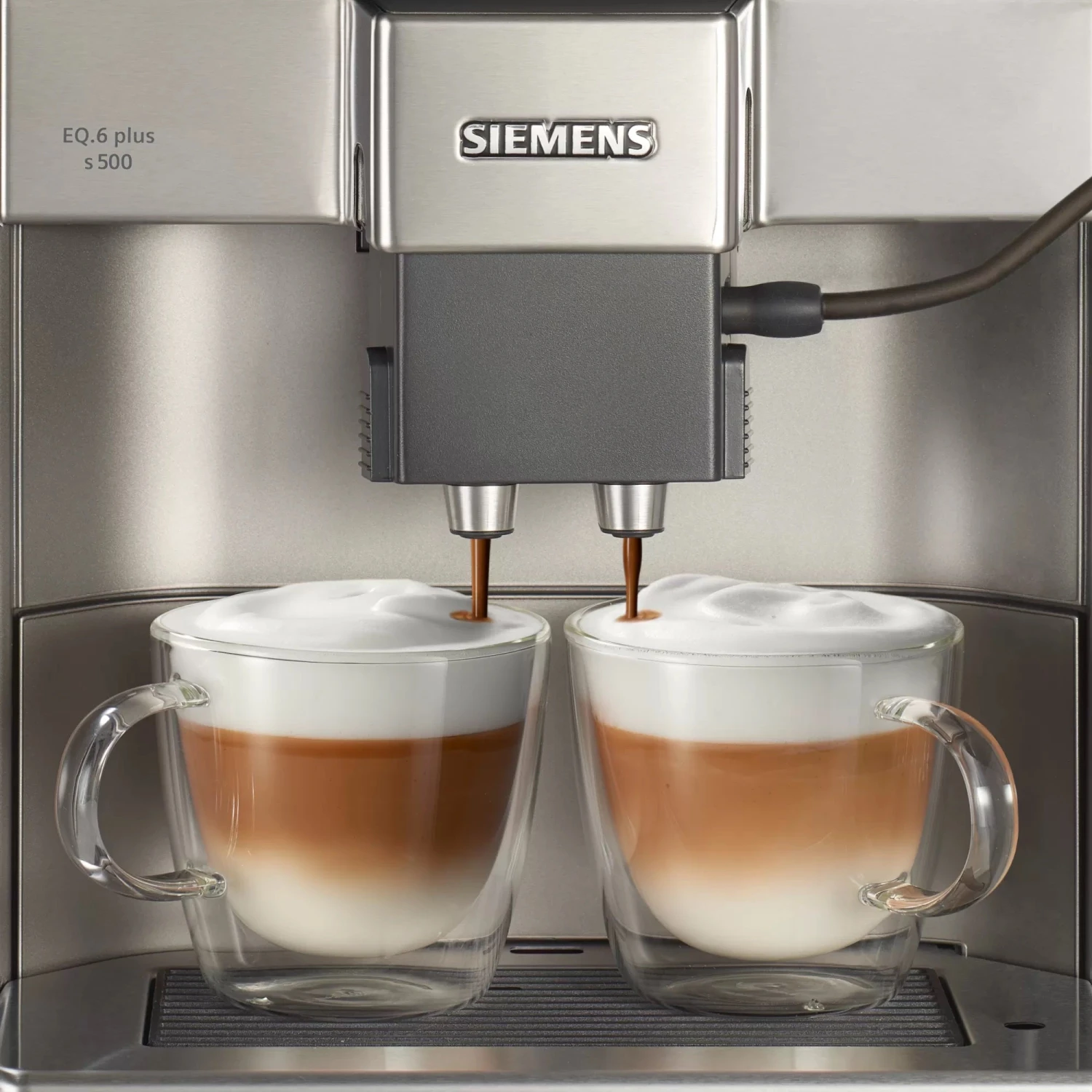 De Siemens EQ.6 plus s500 TE655203RW – Morning Haze is een bean to cup espresso machine zonder poespas. Het is een mooie en degelijke volautomaat die met 1 druk op het touchscreen je favoriete koffiespecialiteit zet. Met of zonder melk, volledig ingesteld naar je eigen voorkeur en zelfs in tweevoud mocht je dit willen.en je favoriete koffiespecialiteit zet. Met of zonder melk en volledig ingesteld naar je eigen voorkeur.
